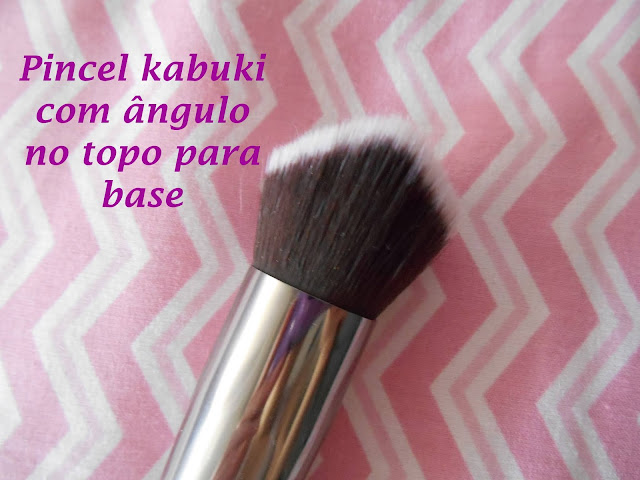 Os pincéis kabuki estão toda hora sendo reformulados pra trazer opções que se adaptem ao formato do rosto, pra espalhar base certinha e uniforme em todo ele. Esse kabuki tem um corte diferente no topo, pra se encaixar abaixo dos olhos e em volta do nariz, deixando tuuudo lindo. Eu adorei o modelo, mas nada que um flat top ou angle top também não façam.